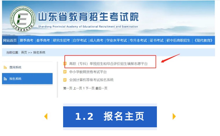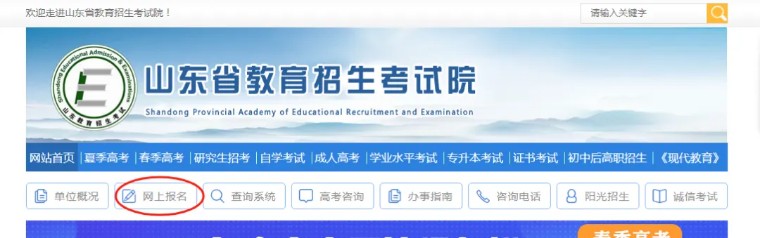 1、登录山东省教育招生考试院官网,点击【网上报名】。