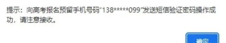 若遗失个人短信验证密码,可在登录页面输入考生号、报名证件号码、图片验证码、“点击发送”,系统提示:向高考报名预留手机号码“1**********”发送短信验证密码操作成功,请注意查收。如下图::