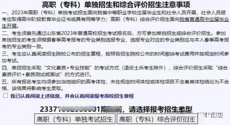 考生身份验证成功后,进入“注意事项提示和报考招生类型选择”页面,如下图: