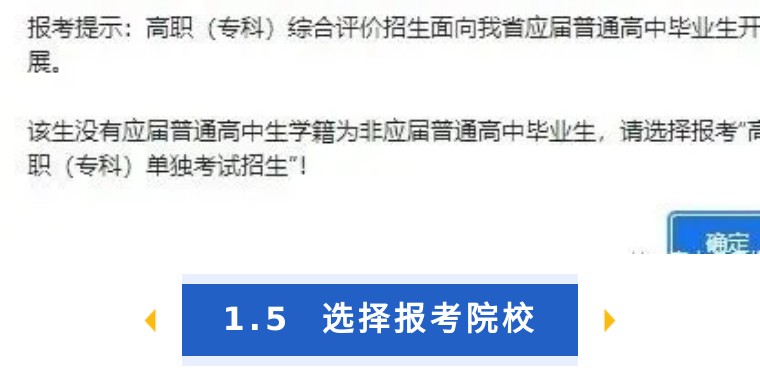 若考生为非应届普通高中毕业生,点击“高职(专科) 综合评价招生”,系统将提示不允许报考:高职(专科) 综合评价招生面向我省应届普通高中毕业生开展。该生没有应届普通高中生学籍为非应届普通高中毕业生,请选择报考“高 职(专科) 单独考试招生”!如下图: