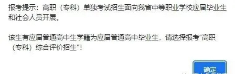 若考生为我省应届普通高中毕业生,点击“高职(专科) 单独考试招生”,系统将提示不允许报考:高职(专科) 单独考试招生面向我省中等职业学校应届毕业生和社会人员开展。该生有应届普通高中生学籍为应届普通高中毕业生,请选择报考“高职(专科) 综合评价招生”!如下图: