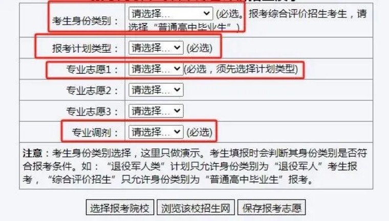 该页面上半部分列出了报考院校本次招生专业设置情况,下半部分是考生身份类别、计划类型、报考专业志愿选择等。