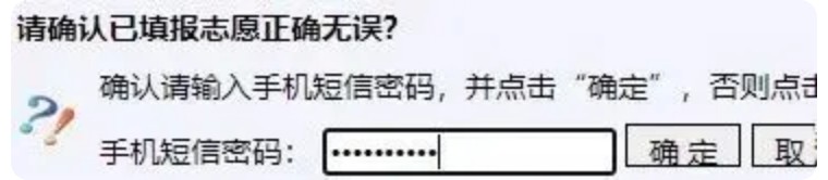 点击“保存报考志愿”按钮,系统提示:请确认已填报志愿正确无误?确认请输入手机短信密码,并点击“确定”,否则点击“取消”。如下图: