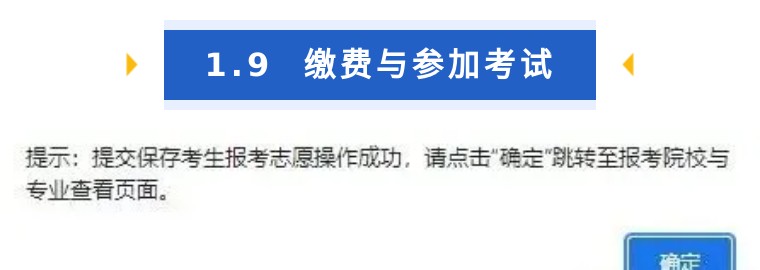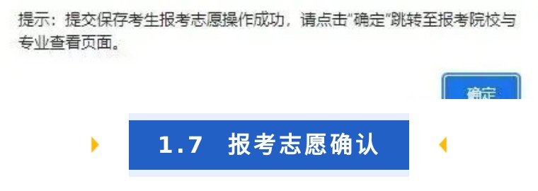 在报考专业选择页面,系统提示保存志愿成功后点击“确定”进入报考志愿 查看及确认页面,如下图: